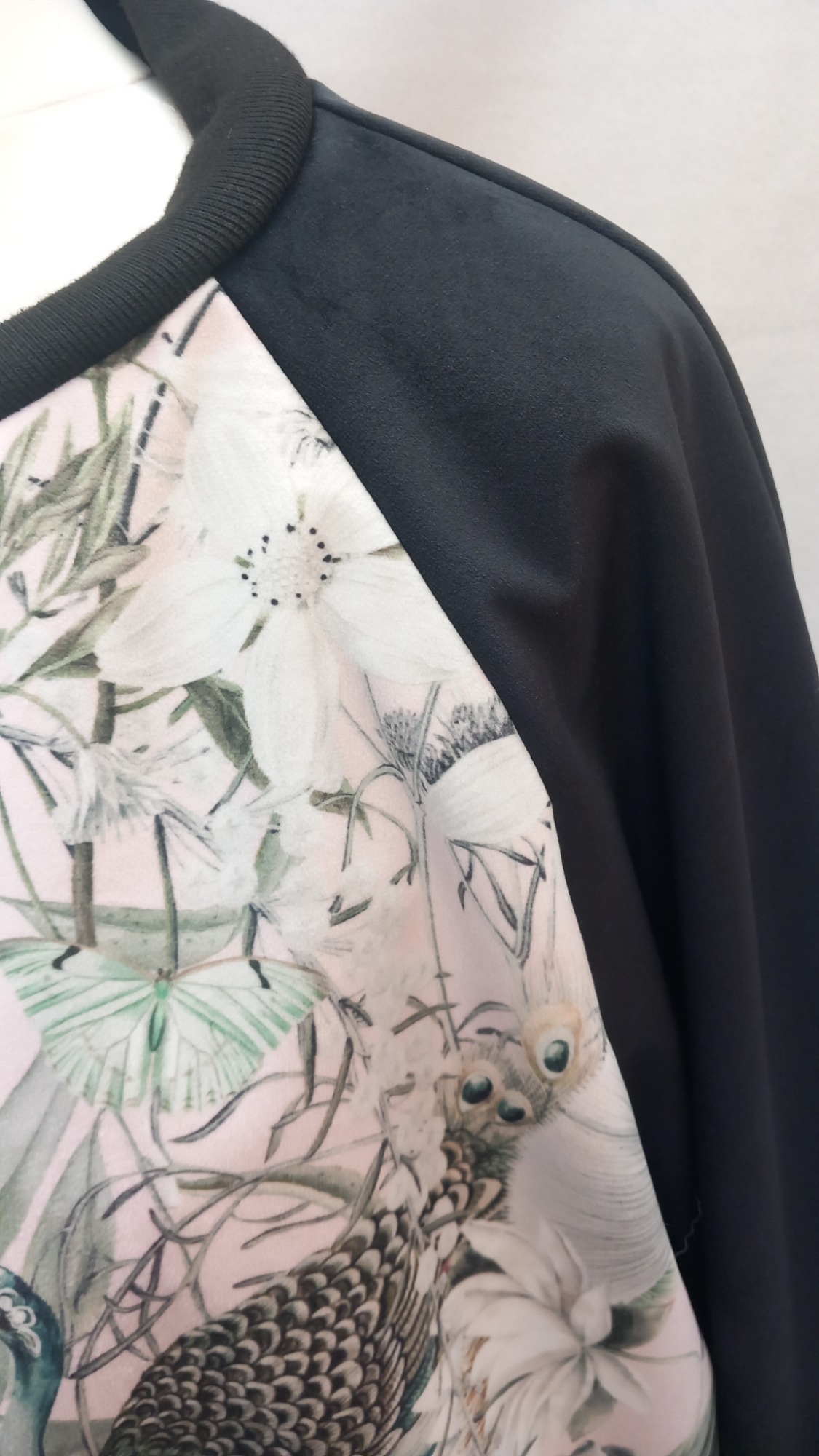 The bomber jacket currently comes in womans and childrens sizes. The adult version has a raglan sleeve and the childs has a straight sleeve.